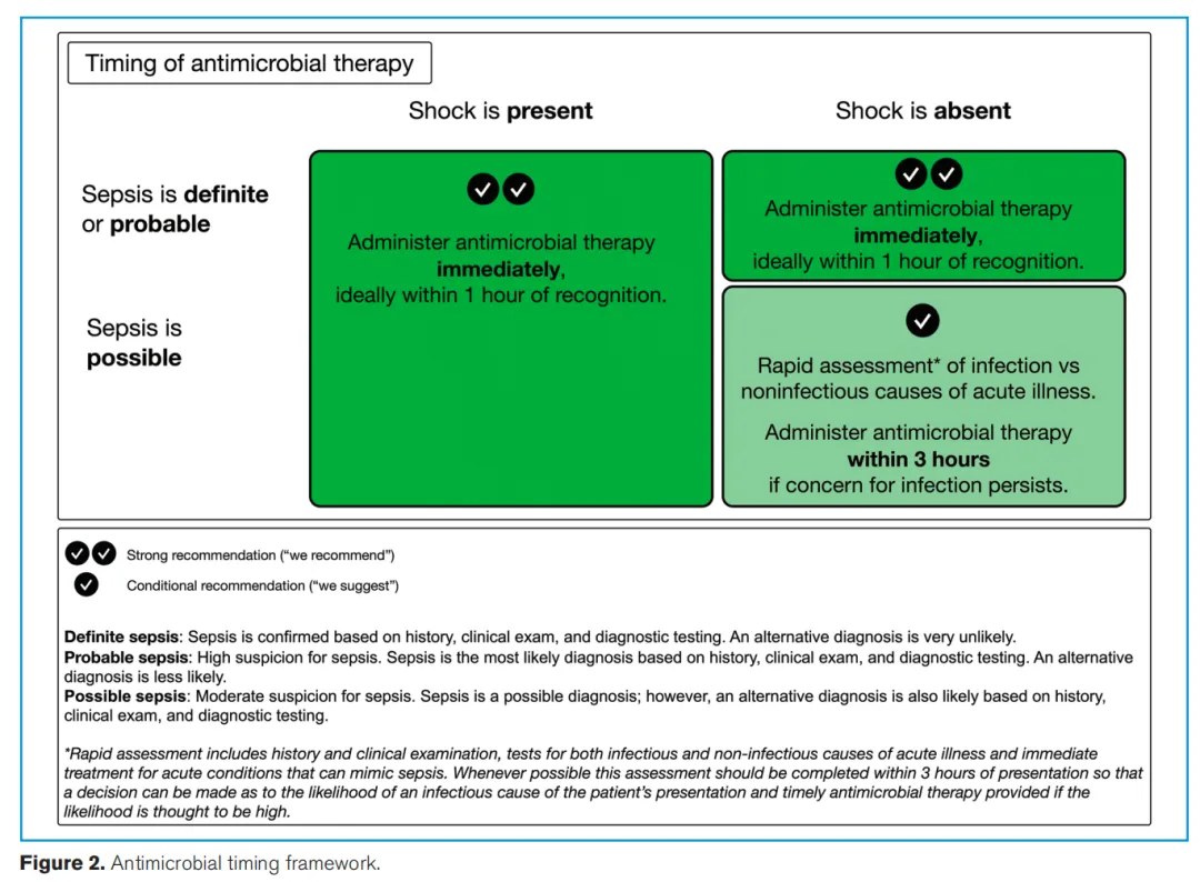 • 条件推荐:可疑脓毒症无休克3小时内完成评估并用药(极低证据)