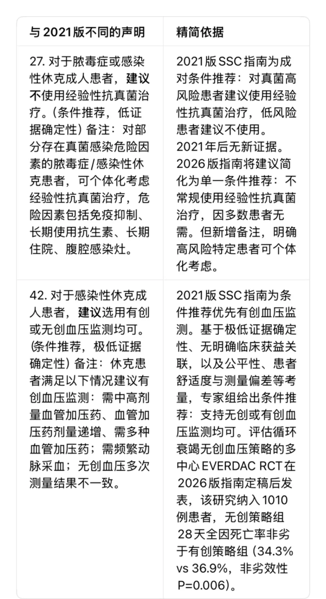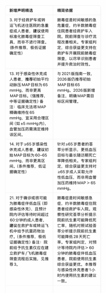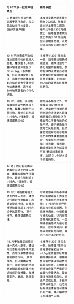 表2 与2021版拯救脓毒症运动指南不同的声明精简依据